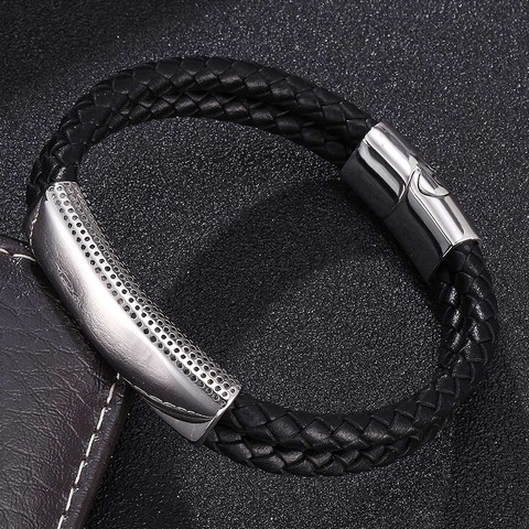2025男性ブレスレット本物の二重層編み革ブレスレットステンレス鋼磁気クラスプバングル男性用