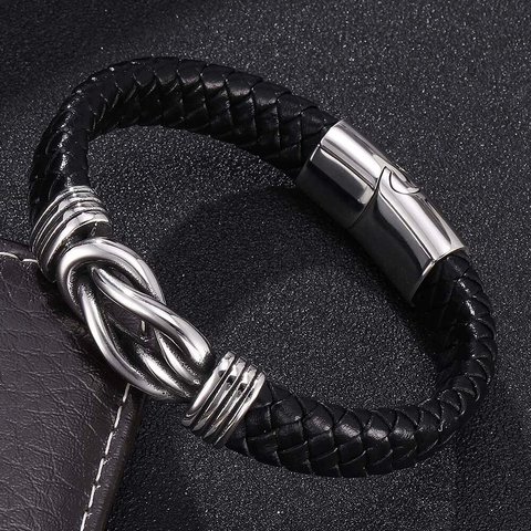 トップステンレススチール本革メンズブレスレットブラックカラー編組インフィニティノットチャームブレスレットアクセサリー男性用ジュエリー