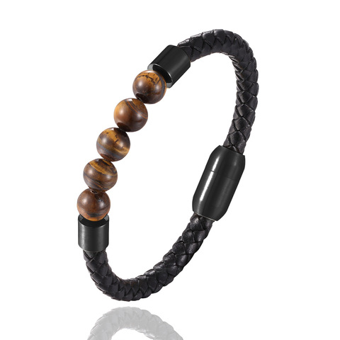 男性用ステンレスブレスレット天然タイガーアイ火山ロックレザーロープ編組ファッショナブルなチャームブレスレット